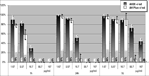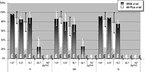 The cytotoxic effects of set material for different periods of time are shown in Fig. 2.Againthe dose-response curves of cell survival were obtained. AH Plus was again significantly (F-test, P < 0.05) more cytotoxic than AH26 in concentrations of 16.7 g mL_1, for 1 and 24 h setting times and also at 55.7 and 167 g mL_1 for the 7-day period. Further, the cytotoxic effect was shown to be dependent on the setting time. ForAH26, reduced cytotoxicity was found for samples set for 7 days, when compared to 24 and1 h setting times, for concentrations of 16.7, 55.7 and 167 g mL_1 (P < 0.05 for 24 h vs.7 days comparison, as well as for 7 days vs. 1 h comparison). The cytotoxicity of AH Plus was reduced only after 7 days for the concentration of16.7 g mL_1.