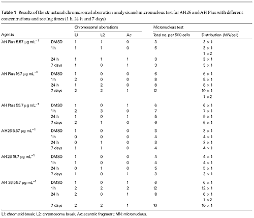 Table 1. Results of the structural chromosomal aberration analysis and micronucleus test for AH26 and AH Plus with different concentrations and setting times (1 h, 24 h and 7 days).